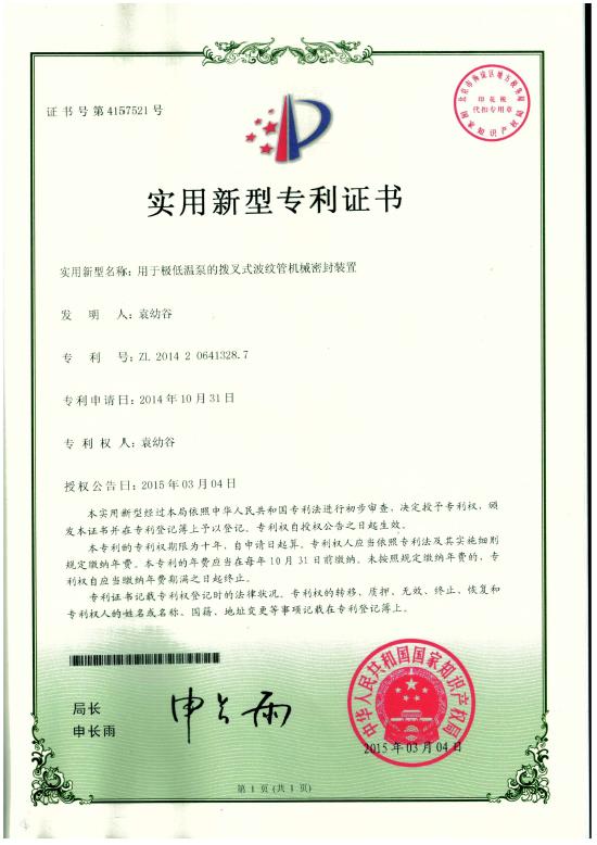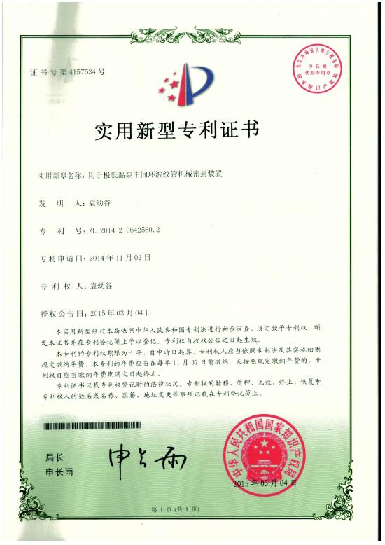 专利:用于极低温泵中间环波纹管机械密封装置