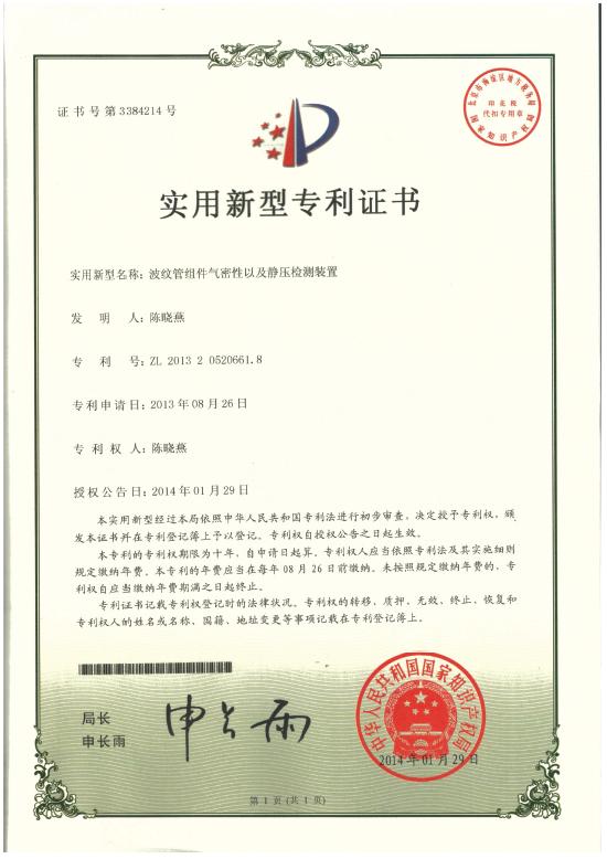 专利:波纹管组件气密性以及静压检测装置