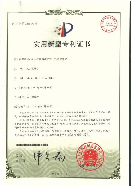 专利:泵用双端面波纹管干气密封装置